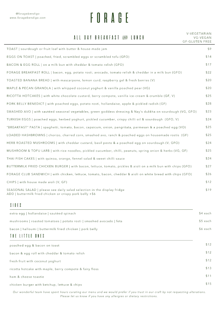 Introducing the menu at Forage Bendigo, a delightful cafe located at 917 Wellington St, Strathfieldsaye, VIC. Renowned for its warm atmosphere and family-friendly vibe, Forage presents a varied menu that celebrates fresh, thoughtfully sourced ingredients. The highlights include breakfast staples like the Pork Belly Benedict and Ricotta Hotcakes, alongside vegan options such as Mushroom & Tofu Larb and Smashed Avo.